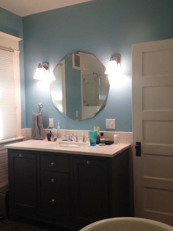 Small craftsman bathroomThis bathroom originally had just the clawfoot tub and we added custom neoangle shower, a custom vanity, and a vintage mirror sourced by the client.